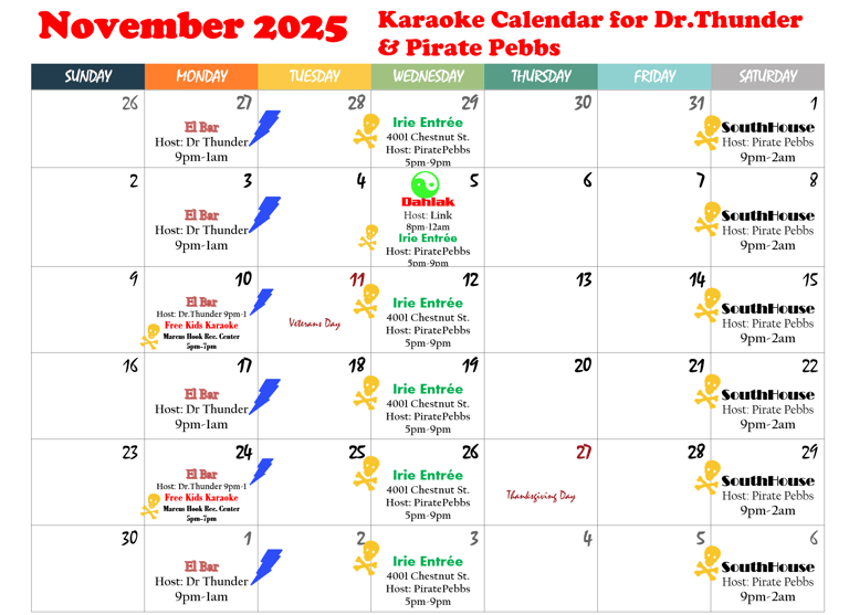 PiratePebbs does Family Friendly/Kids Karaoke 2x a month on Mondays in Marcus Hook 4:30pm-6:30pm. November 10th & 24th at the Marcus Hook Recreation Center.